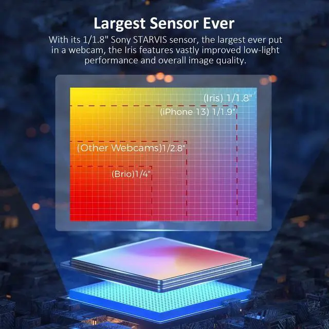 Largest Sensor EverThe NexiGo Iris is equipped with a 1/1.8-inch Sony STARVIS sensor, the largest sensor of any webcam currently on the market, for incredible low-light performance and a wide dynamic range. The 10-element all-glass lens minimizes distortion so you look like your true self on camera.