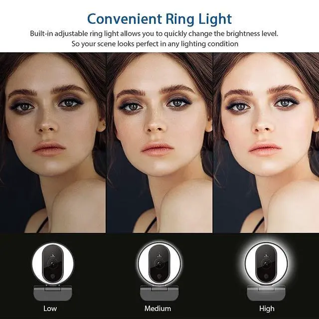 Three Level Adjustable Ring LightThe NexiGo N680E has a built-in light ring that offers lighting compensation at three different levels with touch control. With the N680Es soft lighting you can achieve your ideal light conditions by adjusting to the setting that is perfect for you, no need to worry about glare. It can help light up your scene even in dim light environments. ^^ FHD 1080p Webcam The 80 wide angle lens captures true to life videos and images in 1080p (1920x1080) @ 30 fps. Perfect for Zoom / Facetime / Video Calling / OBS / Twitch / Facebook/ YouTube/ Xbox one/ Conferencing / Gaming / Streaming / Recording / Online School.