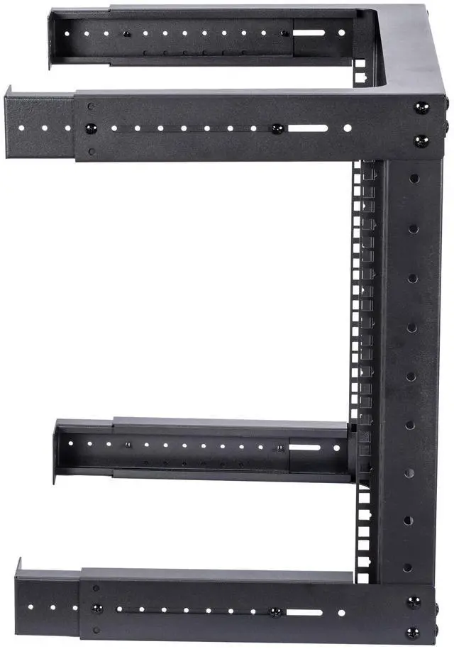 This 9U Open Frame Wall Mount Equipment Rack with Adjustable Depth is a high-quality heavy duty, sturdy relay rack solution that is easy to assemble and install into any environment. It can be mounted to the wall in a server room, office, or above a doorway, expanding your workspace and keeping your equipment easily accessible. This rack features extra large cable openings at top and bottom that prevent kinking and excessive bending of cables. The black textured powder coat finish makes this rack durable and rust-resistant. An adjustable depth ranging from 18-30 inches (Hardware included M6 Cage nuts and screws), in order to accommodate larger data, network and telecommunications devices.