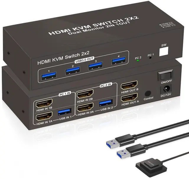 HDMI KVM Switch 2 Monitors 2 Computers 4K 60Hz Dual Monitor USB 3.0 KVM Switcher HDMI 2 in 2 Out with 4 USB Ports to Share Mouse Keyboard Printer and More Supports Extended/Copy Mode