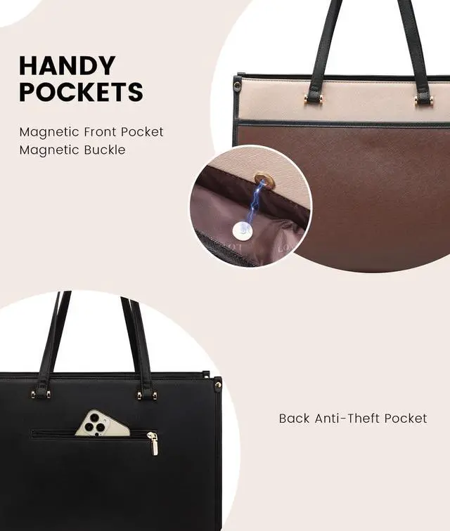 Detachable Magnetic Clutch Purse: 2-in-1design enhance your work tote bag's aesthetic with a functional front envelope clutch that doubles as a decorative accessory. The detachable magnetic clutch transitions smoothly from being an integral part of the laptop tote bag for women to a standalone fashionable wallet, clutch, or wristlet, offering convenience and versatility for your day-to-day styling