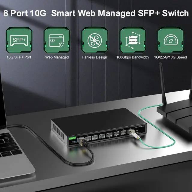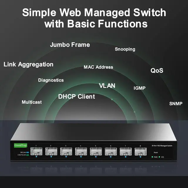 GoodTop 8 Port 10Gb Smart Web Managed SFP+ Switch, 10G Optical Easy Managed SFP+ Ethernet Switch, Metal Fanless Home Lab Network Switch with Link Aggregation/QoS/VLAN/DHCP Client, Black, GT-SWTXG8FM