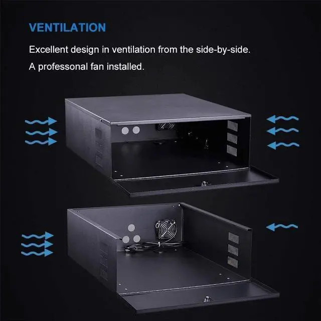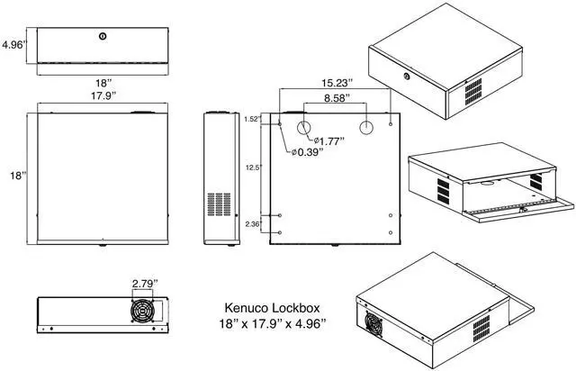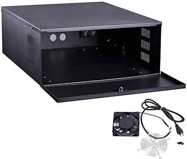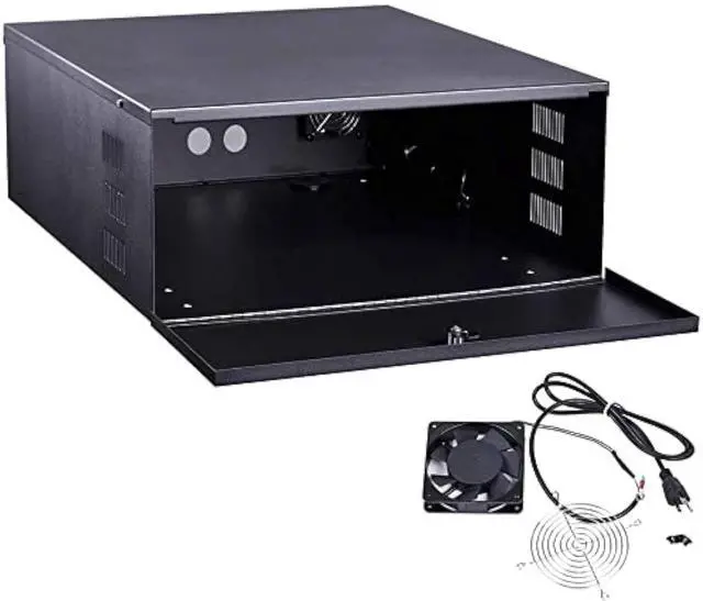 Size: 18'' X 17.9 '' X 4.96 '' ^^ Fan and power cord included for superior cooling ^^ Top cover can also be screwed in for a little extra security or remove the screws for easier access when unlocked ^^ Knock-outs for cable passes ^^ Comes with mounting bolts, rubber feet, power connector for the fan, and a set of keys