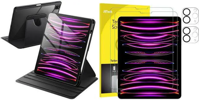 JETech iPad Pro 12.9 -Inch (2022/2021/2020) Rotating Case with Pencil Holder and Screen Protector with Camera Lens Protector Bundle