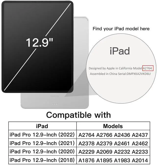 [Compatibility] Designed for iPad Pro 12.9 Inch (6th/5th/4th/3rd Generation, 2022/2021/2020/2018 Model, NOT for 1st/2nd Generation, 2015/2017 Model). Fit iPad Models: A2436 / A2764 / A2437 / A2766 / A2378 / A2379 / A2461 / A2462 / A2229 / A2069 / A2232 / A2233 / A1876 / A2014 / A1895 / A1983. Please check the back bottom of your iPad to find the model number