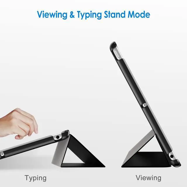 Magnetic smart cover supports automatic sleep/wake function. The tri-fold front cover can support iPad in two standing position for viewing and typing