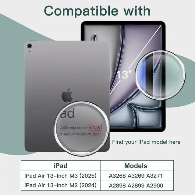 [Compatibility] Exclusively for iPad Air 13-inch M3/M2 (2025/2024). Fit iPad Model Numbers: A3268 / A3269 / A3271 / A2898 / A2899 / A2900. Please Go to Settings > General > About, then tap the Model Number field to reveal the A model number