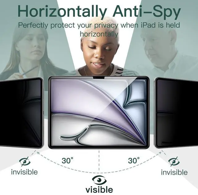 [Privacy Protection] When the iPad is held horizontally, the screen is only visible to persons directly in front of screen, protecting your privacy from peeping by strangers. (Note that the protector will darken the screen a little for a better anti-spy effect. And you can turn up the display brightness for better viewing experience)