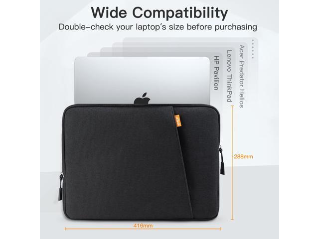 External dimensions: 16.38 x 11.33 x 1.69 inch (41.6 x 28.8 x 4.3cm), internal dimensions: 15.75 x 10.94 x 0.94 inch (40 x 27.8 x 2.4cm). Please check your device dimensions against our laptop sleeve's internal dimensions to ensure perfect fit