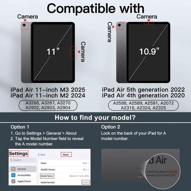 [Compatibility] NOT for iPad (A16) 11th/10th Generation (2025/2022). Designed for iPad Air 11-inch M3/M2 (2025/2024), iPad Air 5/4 (2022/2020 5th/4th generation 10.9-inch). Fits iPad Models: A3266 / A3267 / A3270 / A2902 / A2903 / A2904 / A2588 / A2589 / A2591 / A2324 / A2072 / A2316 / A2325. Please Go to Settings > General > About, then tap the Model Number field to reveal the A model number