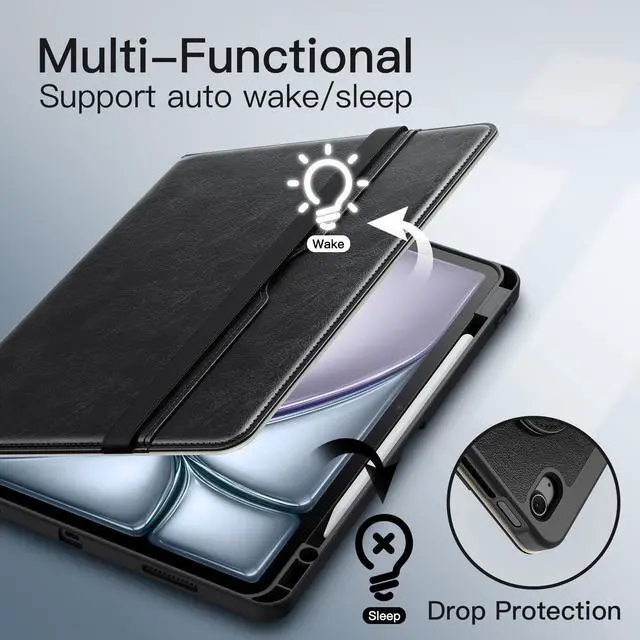 [Auto Wake/Sleep] Wake on open and sleep on close. In addition, built-in pencil holder on the right side allows you to securely store your pencil in the slot (Pencil NOT Included)