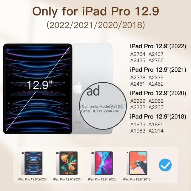 Designed for iPad Pro 12.9-inch (6th/5th/4th/3rd Generation, 2022/2021/2020/2018 Model, NOT for 1st/2nd Generation, 2015/2017 Model). Fit iPad Models: A2436 A2764 A2437 A2766 A2378 A2379 A2461 A2462 A2229 A2069 A2232 A2233 A1876 A2014 A1895 A1983. Please check back bottom of your iPad to find the model number