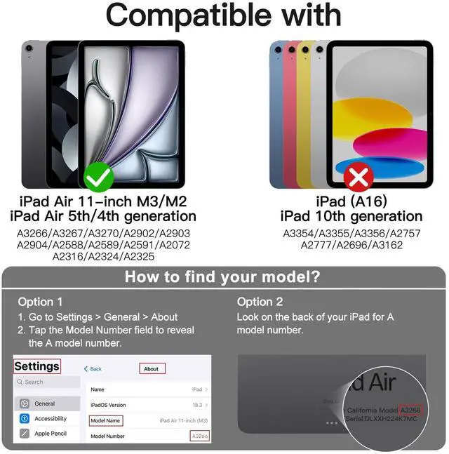 • [Compatibility] NOT for iPad (A16) 11th/10th Generation (2025/2022). Supports Pencil Pro/Pencil(USB-C). Designed for iPad Air 11-Inch M3/M2 (2025/2024), iPad Air 5/4 (2022/2020 5th/4th Generation 10.9-Inch). Fit iPad Models: A3266 / A3267 / A3270 / A2902 / A2903 / A2904 / A2588 / A2589 / A2591 / A2324 / A2072 / A2316 / A2325. Please Go to Settings > General > About, then tap the Model Number field to reveal the A model number