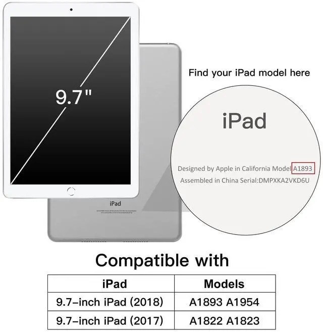 Fit iPad Models: A1822/A1823/A1893/A1954. Please check back bottom of your iPad to find the model number ^^ Made with PC and PU. Slim/light design. Synthetic exterior and smooth interior provide comprehensive protection for your iPad ^^ Magnetic smart cover supports automatic sleep/wake function. The tri-fold front cover can support iPad in two standing position for viewing and typing ^^ [Anti-Scratch] Built with premium tempered glass up to 9H hardness (harder than a knife). Perfectly keep the screen highly resistant to daily scratches and abrasions ^^ [HD & Highly Responsive] Ultra-clear screen protector preserves original resolutions of every photo and video. Also promise an accurate and quick response to every touch and tap[HD & Highly Responsive] Ultra-clear screen protector preserves original resolutions of every photo and video. Also promise an accurate and quick response to every touch and tap
