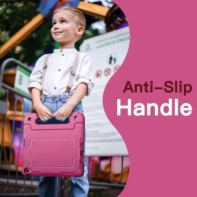 • [Versatile Stand] Designed with a kid-friendly handle with anti-slip texture. It is easy for kids to carry around and fold it back to convert into a sturdy stand for hands-free viewing and comfortable typing