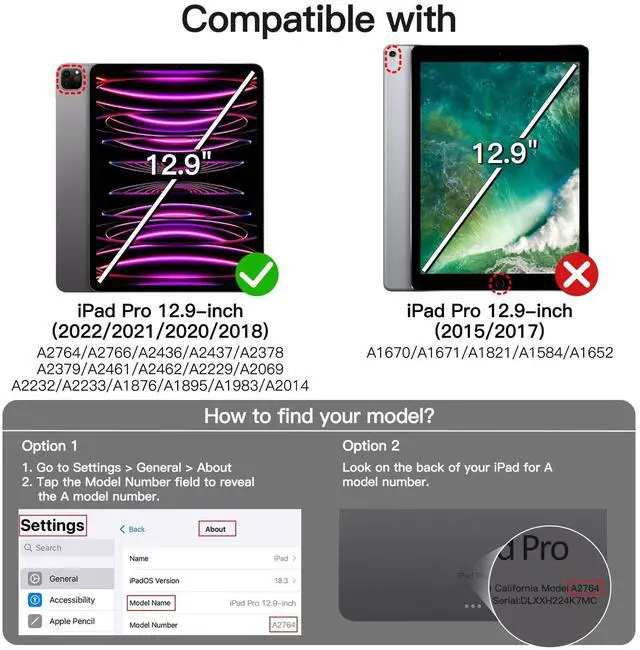 • [Compatibility] Designed for iPad Pro 12.9 Inch (6th/5th/4th/3rd Generation, 2022/2021/2020/2018 Model, NOT for 1st/2nd Generation, 2015/2017 Model). Fit iPad Models: A2436 / A2764 / A2437 / A2766 / A2378 / A2379 / A2461 / A2462 / A2229 / A2069 / A2232 / A2233 / A1876 / A2014 / A1895 / A1983. Please check the back bottom of your iPad to find the model number