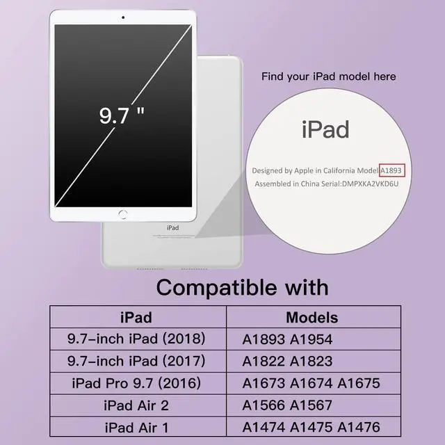 • [Wide Compatibility] Case for iPad 9.7 6th/5th Generation 2018/2017, iPad Air 9.7 2nd/1st Generation 2014/2013 and iPad Pro 9.7 2016. Fit models: A1822 / A1823 / A1893 / A1954 / A1566 / A1567 /A1474 / A1475 / A1476 /A1673 / A1674 / A1675