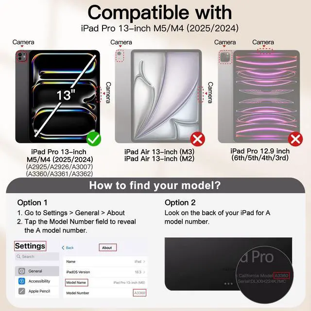 [Compatibility] NOTE: Not for iPad Air 13-inch (M3/M2) / iPad Pro 12.9-inch / iPad Pro 11-inch. Support Pencil Pro/Pencil (USB-C). Designed for iPad Pro 13-inch M5/M4 (2025/2024). Fit iPad Models: A3360 / A3361 / A3362 / A2925 / A2926 / A3007. Please carefully check the back of your device to find the model number