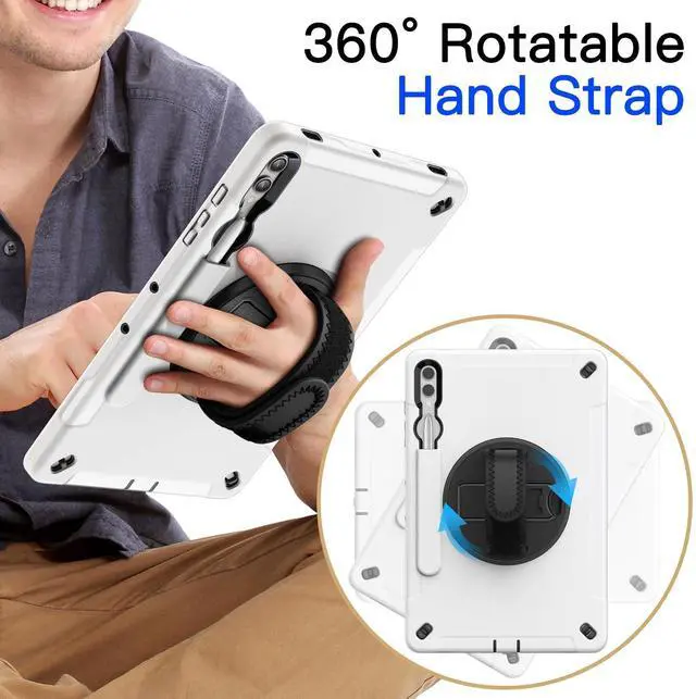 [360 Rotating Kickstand & Hand Strap] Prop up the tablet in horizontal and vertical angles for hands-free viewing, drawing or typing. And you can firmly hold the tablet with single hand wearing the adjustable hand strap