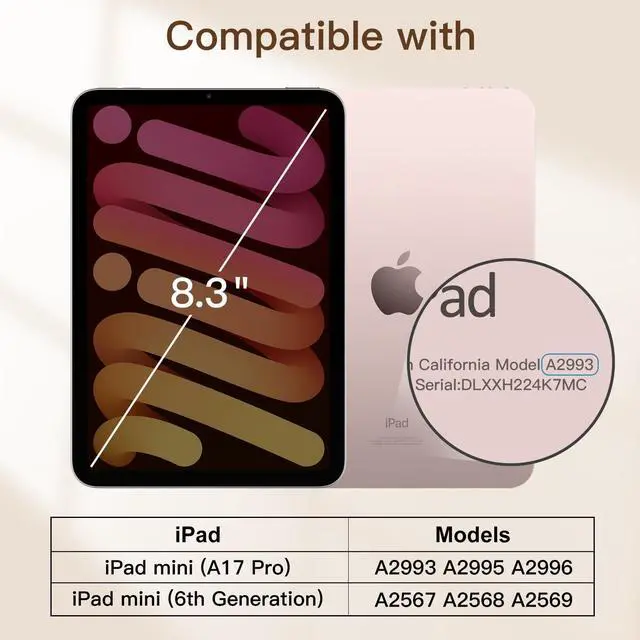 [Compatibility] Specially fit for iPad mini (A17 Pro, 2024 model, 7th generation) / mini 6 (2021 model, 6th generation). Fit iPad models: A2993 / A2995 / A2996 / A2567 / A2568 / A2569. Please check the back bottom of your iPad to find the model number