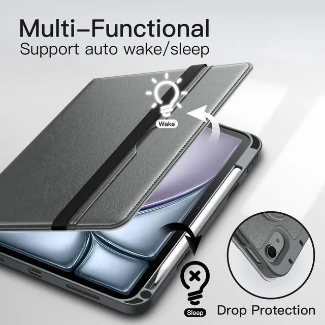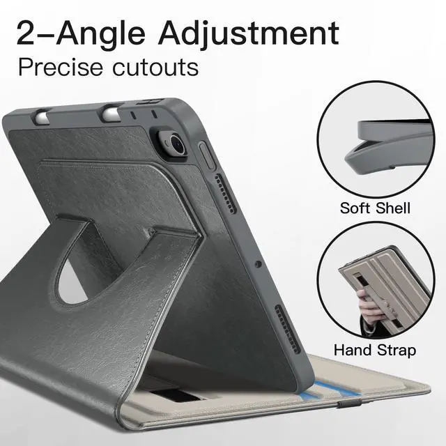 Fits iPad Models: A3266 / A3267 / A3270 / A2902 / A2903 / A2904 / A2588 / A2589 / A2591 / A2324 / A2072 / A2316 / A2325. Please Go to Settings > General > About, then tap the Model Number field to reveal the A model number ^^ [Quality Materials] Built with a premium PU leather exterior and a soft TPU inner back. Highly protect your iPad against scratches and drops. Durable, classic and comfortable to touch ^^ [360 Degree Rotating] The case coming with a 360 degree swivel design, stably supports your iPad whether in a portrait or landscape stand mode in various angles with two anti-slip deep grooves. Functional and convenient ^^ [Auto Wake/Sleep] Wake on open and sleep on close. In addition, built-in pencil holder on the right side allows you to securely store your pencil in the slot (Pencil NOT Included) ^^ [Multi-Function] A large front pocket to store cards, cash, notes and so on. Also come with an exterior elastic strap to fix iPad tightly to the case, and the adjustable inner hand strap helps you firmly hold your iPad