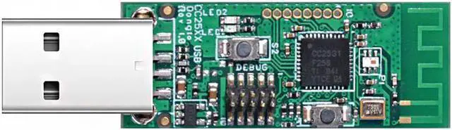 Features: * The CC2531 USB dongle is a fully operational USB device which provides a PC interface to IEEE 802.15. 4 / ZB applications. * Comes with a CC2531ZNP-Prod firmware, it is a ready-to-go CC2531 USB dongle for ZB 2mqtt application. * The dongle can be plugged directly into your PC/Raspberry etc used as a ZB packet sniffer. * Two buttons and two LEDs for user interaction. * Lead out 8 IO connectors. Debug interface. USB dongle size is 5.6 * 1.6 * 0.7 cm.