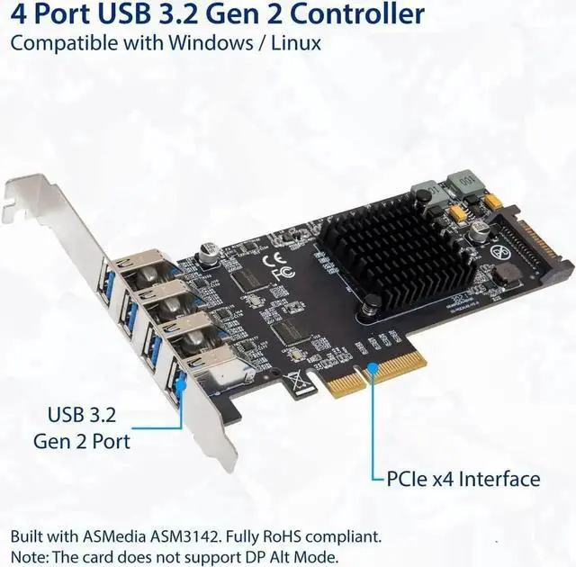 Add four USB 3.2 10Gbps ports to your system. Powered by dual ASMedia ASM3142 controllers to provide dedicated 10Gbps USB 3.2 transfer bandwidth for each port through PCIe 3.0 x4 host interface.