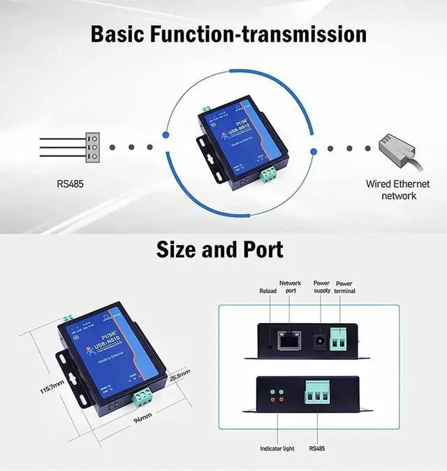* Main Function * -- This RS485 to ethernet adapter can realize bi-directional transparent transmission between RS485 and network. Support Modbus Gateway, Modbus RTU to Modbus TCP, Modbus Polling. Support MQTT/SSL/Modbus RTU to JSON/SNMP/Telnet/Edge Computing