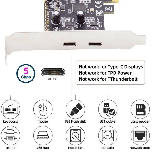 1) The Type-C doesn't support any audio,video and docking output, Not work for any PD power, DP alt mode and Thunderbolt Devices.