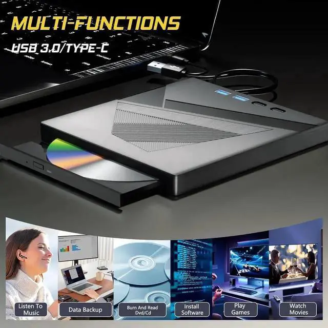 The external CD drive is equipped with advanced USB 3.0 & type-c technology, and backward compatibility with USB 2.0 / 1.1. Offering faster data transfer rates of up to 5 Gigabits/s (625MB/s). The CD burner is approximately 10 times faster than USB 2.0. Additionally, the external CD/DVD drive for laptop boasts a maximum 8x DVDR read speed and a maximum 24x CD write/read speed, delivering faster performance than you anticipated.