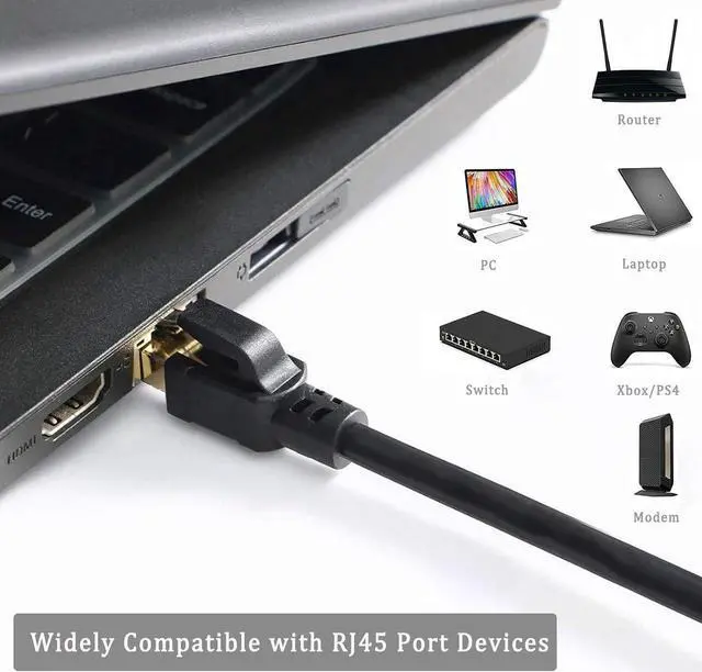 Universal CompatibilityThe cat8 LAN cable works perfectly with WiFi Router, Networking Switch, PC, Laptop, PS3/PS4, X-box, Modem, Patch Panel, and other devices with RJ45 connectors.