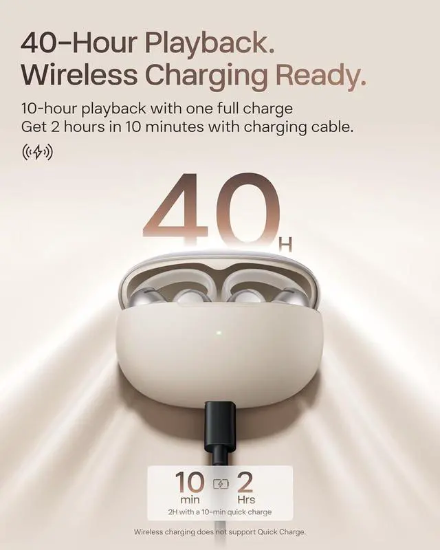 Up to 40 Hours of Listening Enjoy 10 hours on a single charge and up to 40 hours with the charging case. A 10-minute quick charge provides 2 hours of playtime. Wireless charging supported (quick charge is not available via wireless charging).