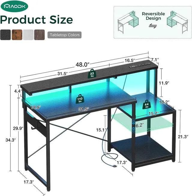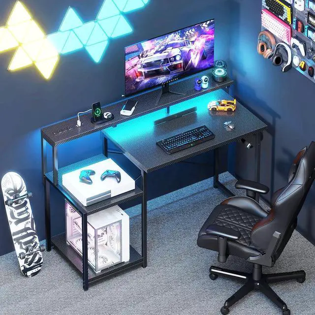 AODK Computer Desk, 48 Inch Gaming Desk with Led Lights & Power Outlet, Office Desk with Storage Shelves, Reversible Desk with Monitor Shelf & Headphone Hook, Carbon Fiber Black