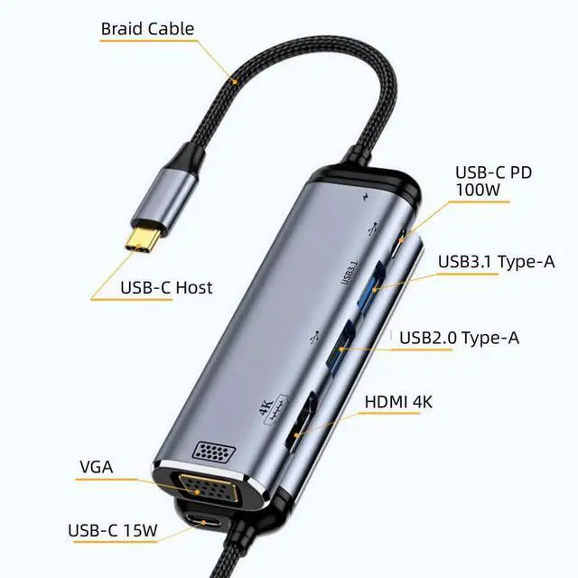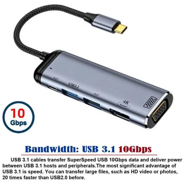 USB-C Type C to HDMI VGA Dual USB 3.0 HUB Converter HDTV Adapter 4K 60hz 1080p with Female PD Power Port You can also connect a charging cable to the USB-C port to charge your laptop. USB-C HDMI VGA Adapter lets you connect your laptop with USB-C port to any HDMI/VGA display or projector. While also connecting a standard USB device and a USB-C charging cable. 4k 60hz HD resolution for HDMI to enjoy entertainment as it was meant. 1080P 60hz HD resolution for HDMI to enjoy entertainment as it was meant. This adapter allows you to mirror your laptop display to your HDMI/VGA-enabled TV or display. The HDMI VGA only one can work at same time. Inout: 1*Type-C Male to Laptop 1*Type-C Female to Power Output: 1*HDMI Female 4K 1*VGA Female 1080p 1*USB2.0 Type-A Female 1*USB3.0 Type-A Female 1*USB3.1 Type-C Female