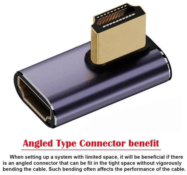 HDMI Male to HDMI 2.1 Female Vertical 90 Degree Left Angled Low Profile UHD Extension Adapter Support 8K 60hz HDTV The HDMI angled type Allowing you to connect it to a female port, even if space around the port is limited. Meets all current HDMI 2.1 specifications and can support all HDTV resolution. Support UHD 8K 60hz HDTV, Supports HDCP and 3D. An HDMI coupler for joining extension cable together. Gold plated contacts and silver shield shell.