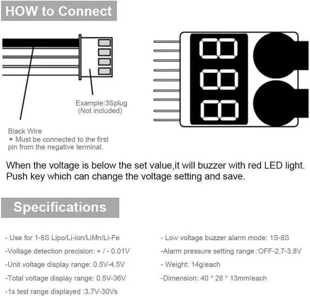 Just plug into the balance plug and the LED will cycle through the individual cell voltages as well as list the total voltage.