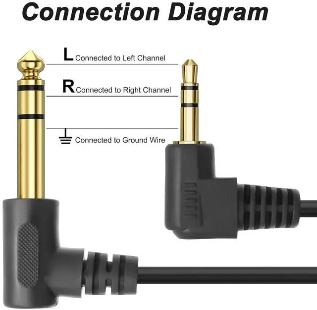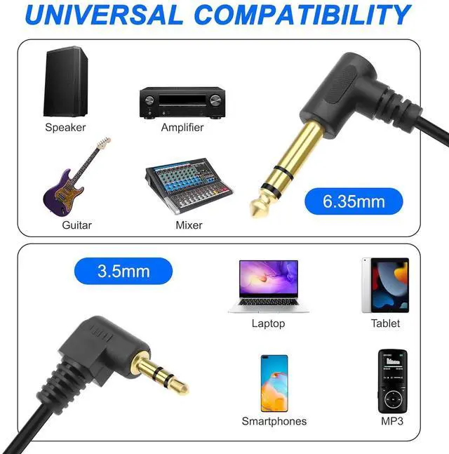 Plug and Play: This Right Angle 3.5mm TRS Male Jack to 6.35mm TRS Male audio cable connects smartphones, tablets or headphones with standard 3.5mm ports to audio devices with a 6.35mm stereo port, e.g., piano keyboard, guitar, amplifier, speakers.