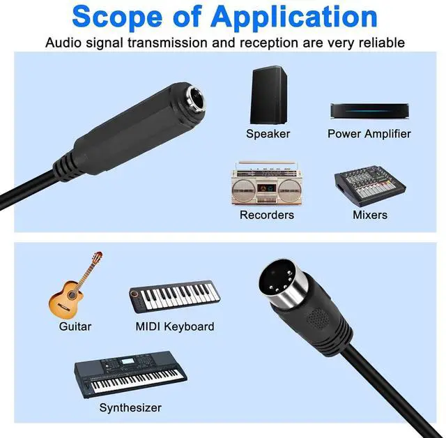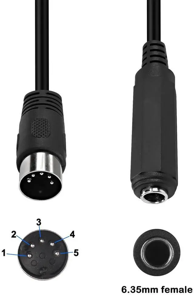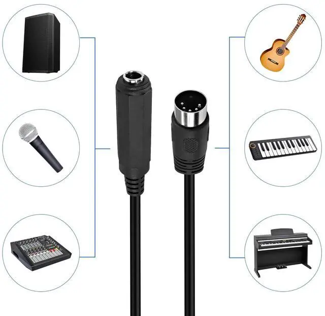 Applies to: DIN 5-pin to 6.35mm adapter cables are used to connect speakers, amplifiers, mixers and recorders to MIDI keyboards, synthesizers, organs, electric pianos, guitars and other stereo equipment with DIN 5-pin connectors.