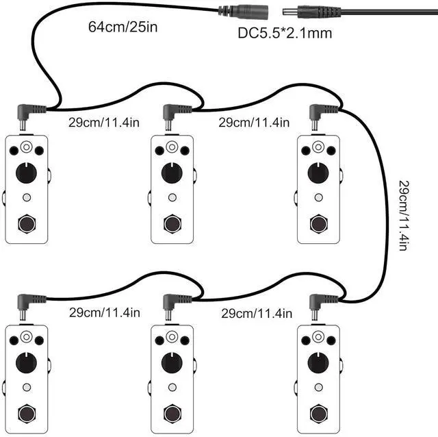 DC Splitter CableThe wire diameter of the cable is 22AWG, 6 right-angle plugs make your connection orderly and make your circuit board neat and tight. The maximum distance between each plug is 29cm, which is long enough to provide power to pedals organized in various ways on a pedal board or the ground. Helps tidy things up, and less wires hanging around.