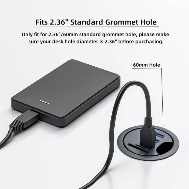 Tool-free Installation: Plug and play and support hot plugging. In addition, the LED light can easily show its working status. steps to put the hub into the table hole. which is more user-friendly and practical design. Fits 2.36" Standard Grommet Hole: Only fit for 2.36"/60mm standard grommet hole, please make sure your desk hole diameter is 2.36" before purchasing.