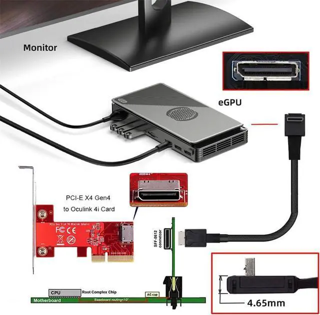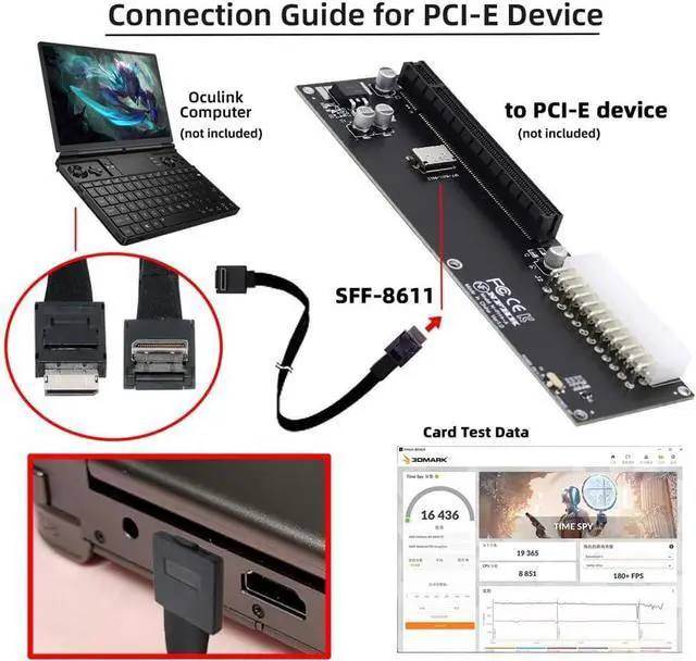 • Data transfer rate up to 64Gbps, Transmits PCI Express 4.0 signals using the oculink protocol.