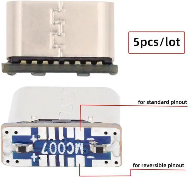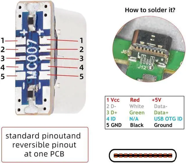 Two pinout at the connector, Please check the micro usb pinout is standard or reversible pinout when you solder it.You need to solder the connector yourself. Proficien in manual soldering techniques is required.