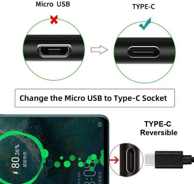 The hole of Micro-USB is larger than that of Type-C. You need to repair the hole yourself when changed the plug.Fast power and data,Offers a throughput of up to DC 5V 2A when used with a Type-C USB2.0 power and device.