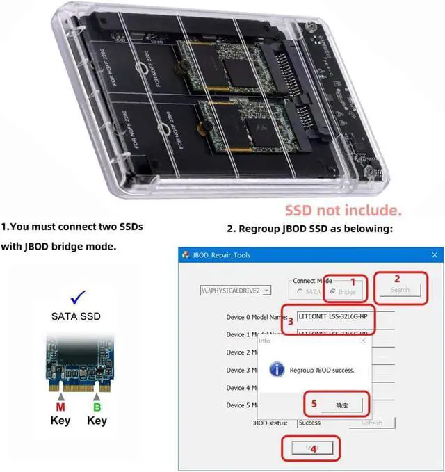 Dual NGFF B+M-Key M.2 SSD Card JOBD Raid0 Span Bridge to USB3.0 Type-C USB-C 2.5inch SATA Combo Enclosure