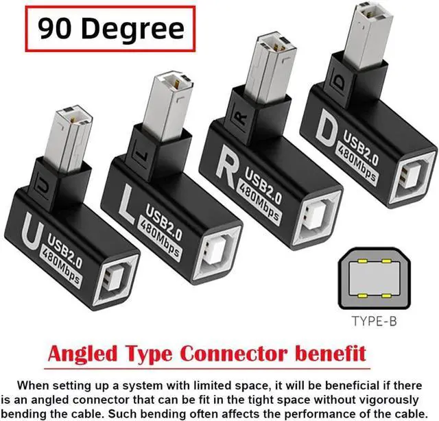 2. Used to connect USB Type B cables in tight fit applications. Can work for Printer Scanner Hard Disk extension.