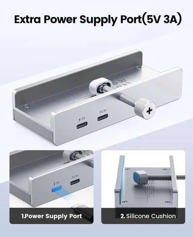 Clip-on Hub Design The ORICO USB hub with adjustable screw allows mounting screen edges or desktop edges with a thickness of 5-28mm. Semi-permanent mount that won't move or move when plugging and unplugging. Parts in contact with the desk or monitor are covered with soft silicone pads to prevent scratches