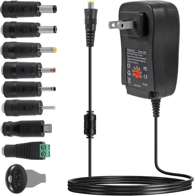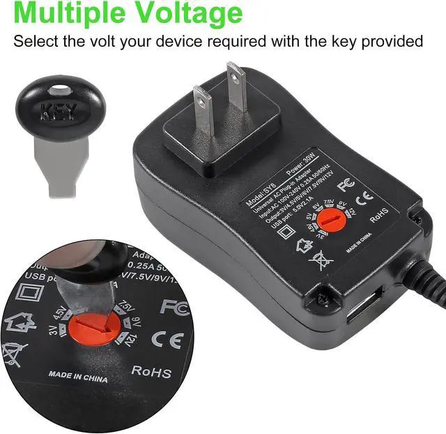 AC Input: 100V 120V-240V 50/60Hz, Output: Multi Voltage DC 3V 4.5V 5V 6V 7.5V 9V 12V; 7 Adjustable Voltages Input: AC 100-240V 50/60Hz. There are 7 output options for you, DC 12 Volt/ 4.5Volt / 5 Volt/ 6 Volt/7.5 Volt/9 Volt/ 3 Volt. Lost or damaged power suppliy can be easily replaced!