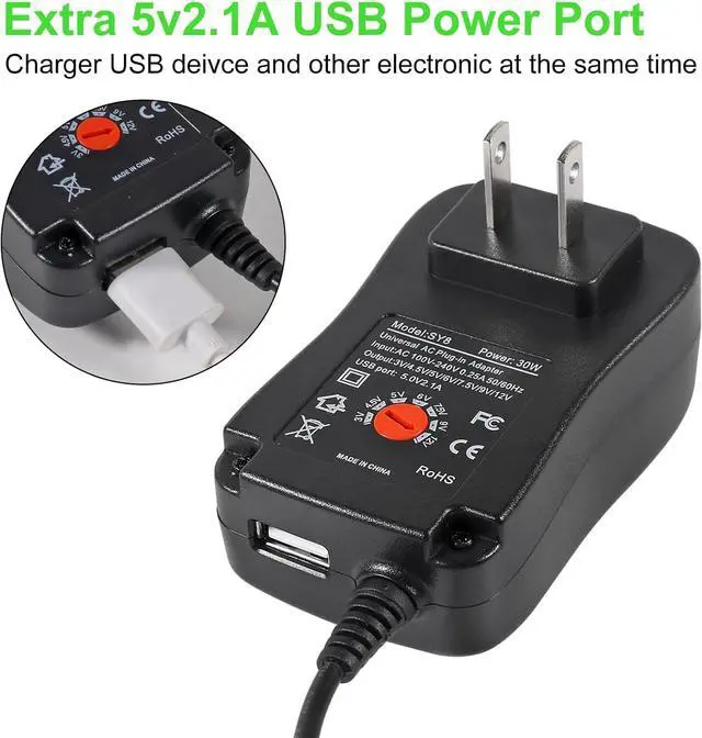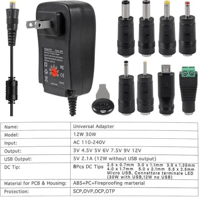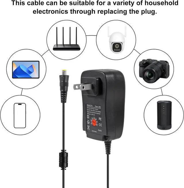 Compatible with most polular AC/DC products, such as LED Strip Lights, Keyboard, Scales, Routers, Speakers, CCTV camera system, USB Charging Camera, DVD Player, CD player, USB hub, recorder, exercise bike, clock, trail camera, weather station and more 3V to 12V household electronics.