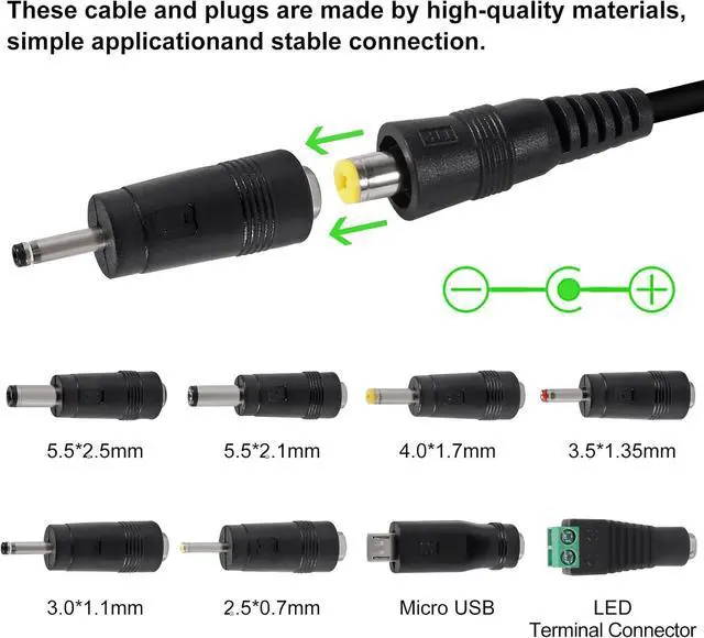 A set of popular interchangeable DC connectors. Works with 99% of AC/DC home appliances, such as router, led strips, lamp, webcams, security cameras, HDMI switchers, GPS, usb hub, tablets, electronic gizmos, DIY circuits and more. Add a Micro USB plug and LED terminal connector, good for use.