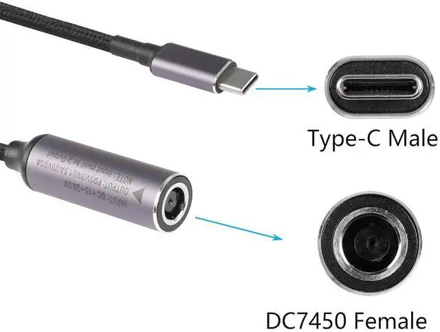 Input & OutputInput: DC7450 female connector,15V-20.5V. Output: type-c male connector, PD 5V/9V 1.5A,20V 5A, PD output no 12V,15V. NOTE: INPUT MUST BE >OUTPUT. Cable length: 17.4cm/6.8inch/0.57ft.